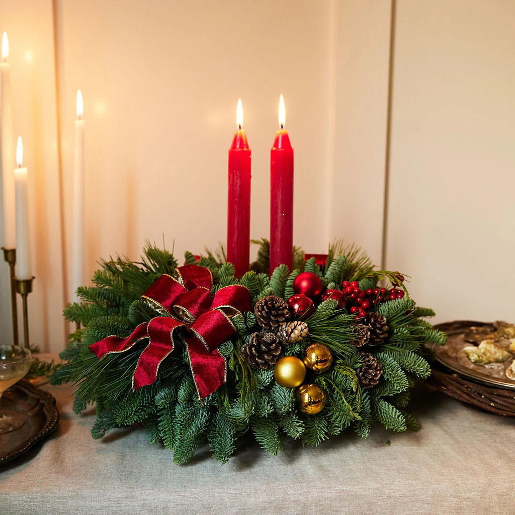 Where candlelight flickers and classic colors shimmer, Burning Bright sets the perfect holiday scene. A celebration of light and tradition, this centerpiece captures the essence of the season in every detail, along with a pair of wide, artisanal taper candles. Noble fir, cedar, and pine come together to create a luscious base, accented with glistening red and gold ball ornaments and frosted pinecones. Red satin bow tucks with fine gold accents lay amongst the greenery, adding a touch of sparkle. The two high-end, extra-large red taper candles have a textured, hand-hewn finish that evokes old-world charm, with a long 15-hour burn time. They are arranged at the center, catching the light just right. With its rich colors and glowing ambiance, Burning Bright is perfect for winter gatherings, family dinners, or simply making home feel extra special this time of year.