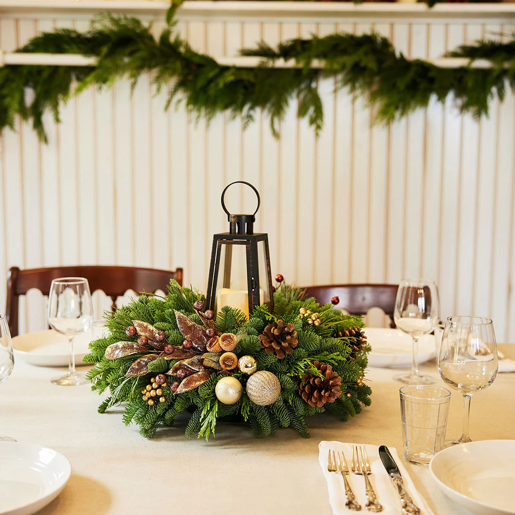 Capture the heart of the holidays with this cozy and refined centerpiece, Hearth & Home. Rustic with just the right amount of glamour, this centerpiece welcomes a festive sense of warmth with its woodland touches and abundance of elegance. Handcrafted with a fresh base of noble fir, cedar, and pine, we place radiant gold ball ornaments, graceful faux gold berries, and faux bronze berry branches amongst the lush greenery. Real pinecones add touches of nature. At the center lies an eye-catching brown metal lantern with a light up LED candle inside, casting a cheerful glow upon all who gather near. Hearth & Home is classic, heartfelt, and beautifully timeless – a showstopping gift for you and your loved ones.