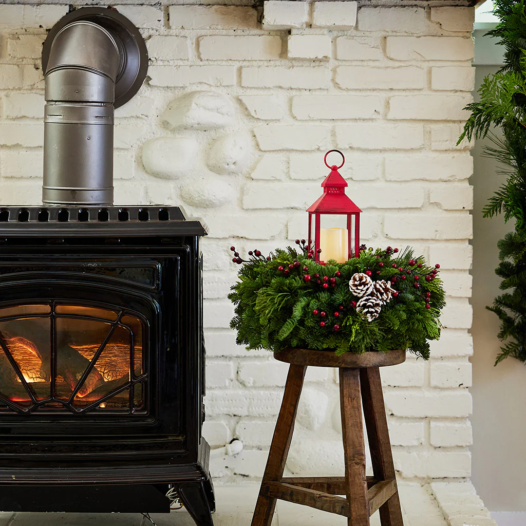 Our gorgeous 'Let It Glow' centerpiece quickly became a customer favorite! This delightful red Christmas centerpiece is perfect for the holidays and sure to brighten any home and deliver cheer. Fresh noble fir, cedar, and white pine accompanied by red berries, and frosted pinecones are topped with a working red LED lantern, perfectly designed for the holidays. Keep the sturdy, red lantern when the holidays are over and enjoy it on your mantle or anywhere in your home. Requires 2 AAA batteries which are not included. This centerpiece measures approximately 18" across and 12" tall.