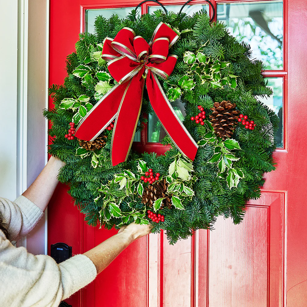 Our Mixed Holly Christmas wreath combines two favorites of the holiday season, aromatic noble fir and holly! Variegated holly is mixed throughout the fresh and fragrant base of noble fir, all hand-selected locally. The base of fresh greenery is accented with natural pinecones and a lush hand-tied red velveteen bow. Simply perfect for Christmas! Available in 26" & 32" sizes. 4-Pack contains four 26" wreaths and ships to one address.