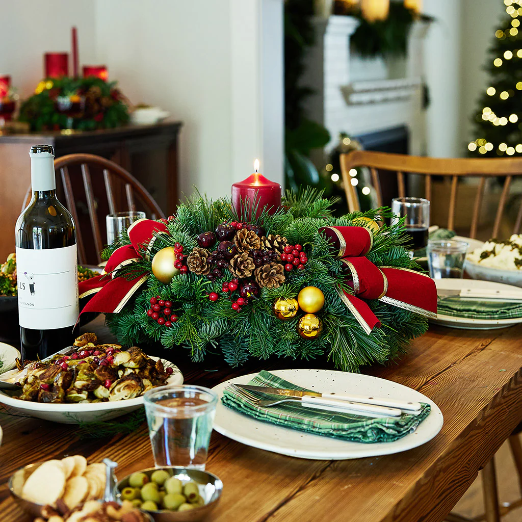 Materials: noble fir, pine, cedar, with natural pinecones, gold ball clusters, red berry clusters, faux crabapples, red velveteen with gold-edged bows, and a pomegranate-red pillar candle.Â