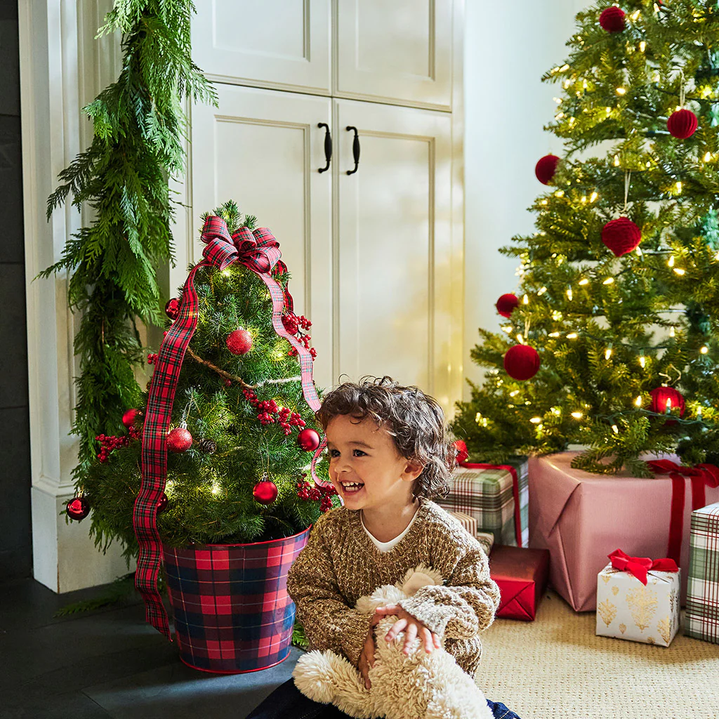 Plaid lovers, rejoice! Perfect Plaid brings classic festive style to life with its traditional mix of woodland accents and gorgeous plaid bows. A vibrant Dwarf Alberta Spruce arrives in a timeless, red-and-green plaid-patterned two-gallon container, ready to bring holiday elegance to your home. The tree comes with faux red berry clusters and pinecones that wrap around the tree along a rustic jute garland. Included with the tree is a box of shiny red ball ornaments - perfect for adding your own festive touch with family or friends. Simply hang the ornaments on the tree as you like, and have fun decorating! A glimmering strand of LED lights is also included separately, ready for you to adorn your tree with sparkle and delight! As a finishing touch, a showstopping red-and-green plaid bow flows down from the top of this beauty. Whether you’re going for a cozy cabin or classic Christmas aesthetic, this tree blends homespun feel with everlasting seasonal charm. This two-gallon tree is approximately 32" - 36" tall.Â