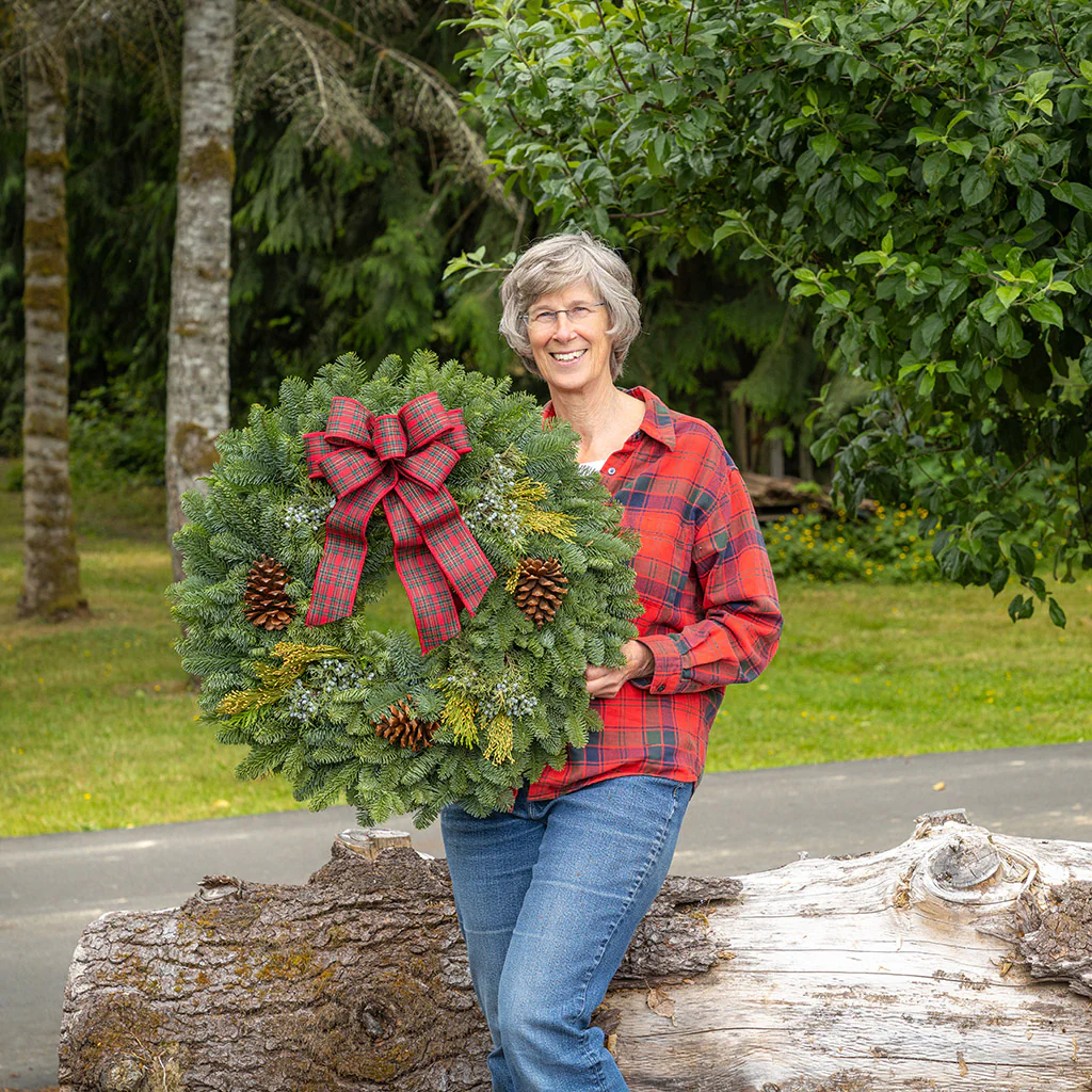 With a beautiful, classic style, this Christmas wreath is one of our most popular. Overflowing with noble fir, juniper, and incense cedar, this live wreath is topped off with ponderosa pinecones and a gorgeous red plaid bow. This best seller makes a wonderful holiday gift for anyone. Available in 26" & 32" sizes. 4-Pack contains four 26" wreaths and ships to one address.