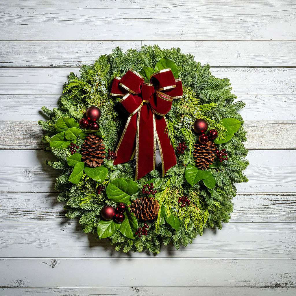 Updated design for 2025! Our elegant Premium Burgundy wreath combines gorgeous coloring with a quintessential classic Christmas design. Its rich burgundy hues deliver stunning, timeless elegance! We hand-assemble a lush base of fresh noble fir, juniper, and cedar and add accents of lustrous oval salal leaves. It’s then adorned with shiny burgundy ball ornaments, burgundy berries, and natural ponderosa pinecones, and is finished with a distinguished burgundy and gold bow. This stunning wreath makes a magnificent gift. Available in 26" & 32" sizes.  Available color options: Burgundy, Red, Gold, and Plaid .