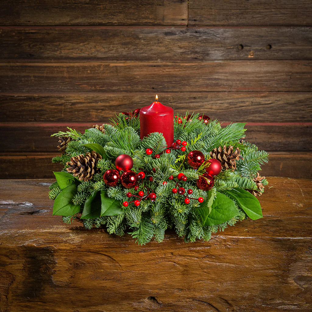 Our new Quiet Gatherings Centerpiece & Lights Special is gorgeous and wonderfully priced at $59.95! With timeless beauty, this arrangement captures the essence of the season perfectly and is 33% off the full price! We include a set of dual-action LED lights. A graceful red pillar candle casts a warm holiday glow and brightens any home. It sits on a lush and fragrant bed of fresh noble fir, cedar, pine, and lustrous oval salal leaves and is accented with shiny red ball ornaments, plenty of red berries, and natural pinecones. The result is a masterpiece that will add warmth and elegance to any gathering or home and make an unforgettable gift. This centerpiece measures approximately 18" across x 10” tall.Â