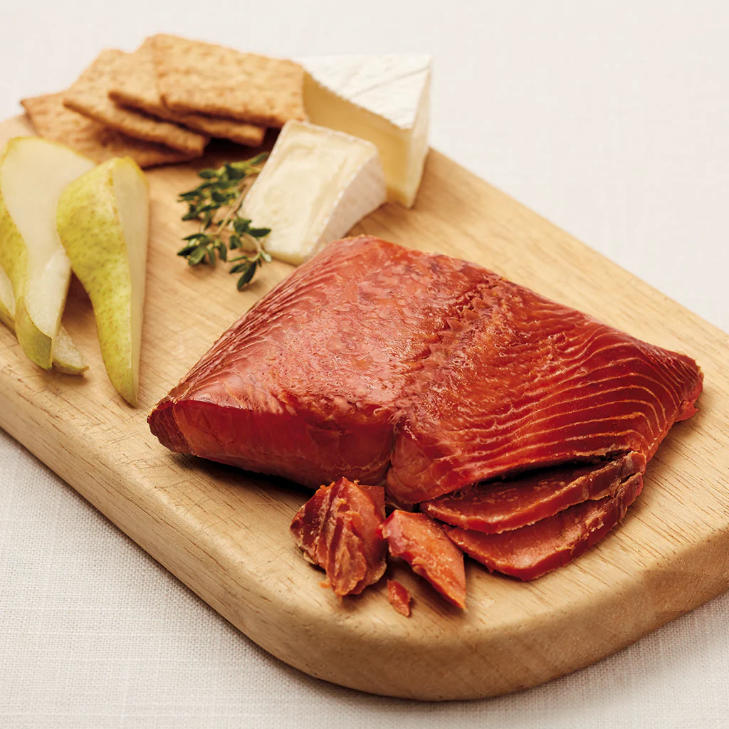 We are excited to have partnered with nearby Seabear Smokehouse to bring our customers this wonderful gift option. They start with locally sourced wild salmon and fillet it by hand. Each salmon fillet is vacuum-sealed in their famous Gold Seal pouch, then gently cooked in its own juices -- this preserves the salmon naturally (a process SeaBear invented), so no refrigeration is needed until opened, making it so easy for sending and sharing as a gift. It’s ready to open and enjoy immediately.