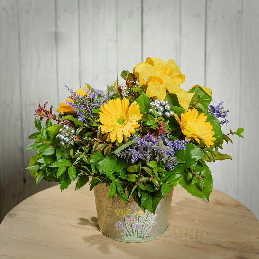 Our Sunshine Serenade centerpiece captures all the bright beauty of spring’s joy and renewal. This gorgeous arrangement bursts with faux, artificial yellow daisies, lavender, and silver berries, artfully mixed with fresh salal and green huckleberry and topped with a lovely yellow linen bow. They fill a charming metal container adorned with wildflowers. This beautiful arrangement is a wonderful way to add some sunshine to your home or to send as the perfect gift to add cheer to someone’s day. It measures approximately 13” across x 12” tall.