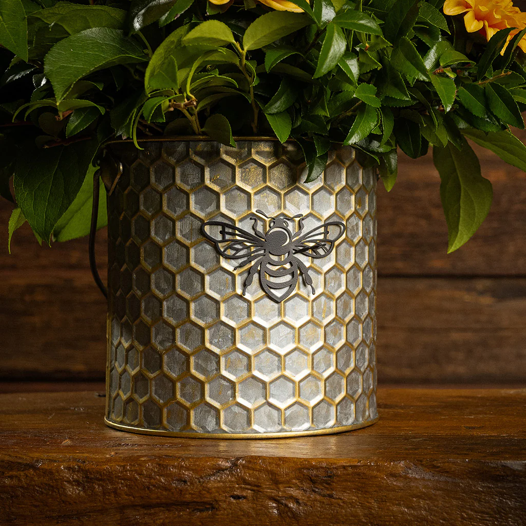 Materials: Fresh salal and green huckleberry with faux orange dahlia flowers and peach branches in a metal honeycomb pot with a honey bee.