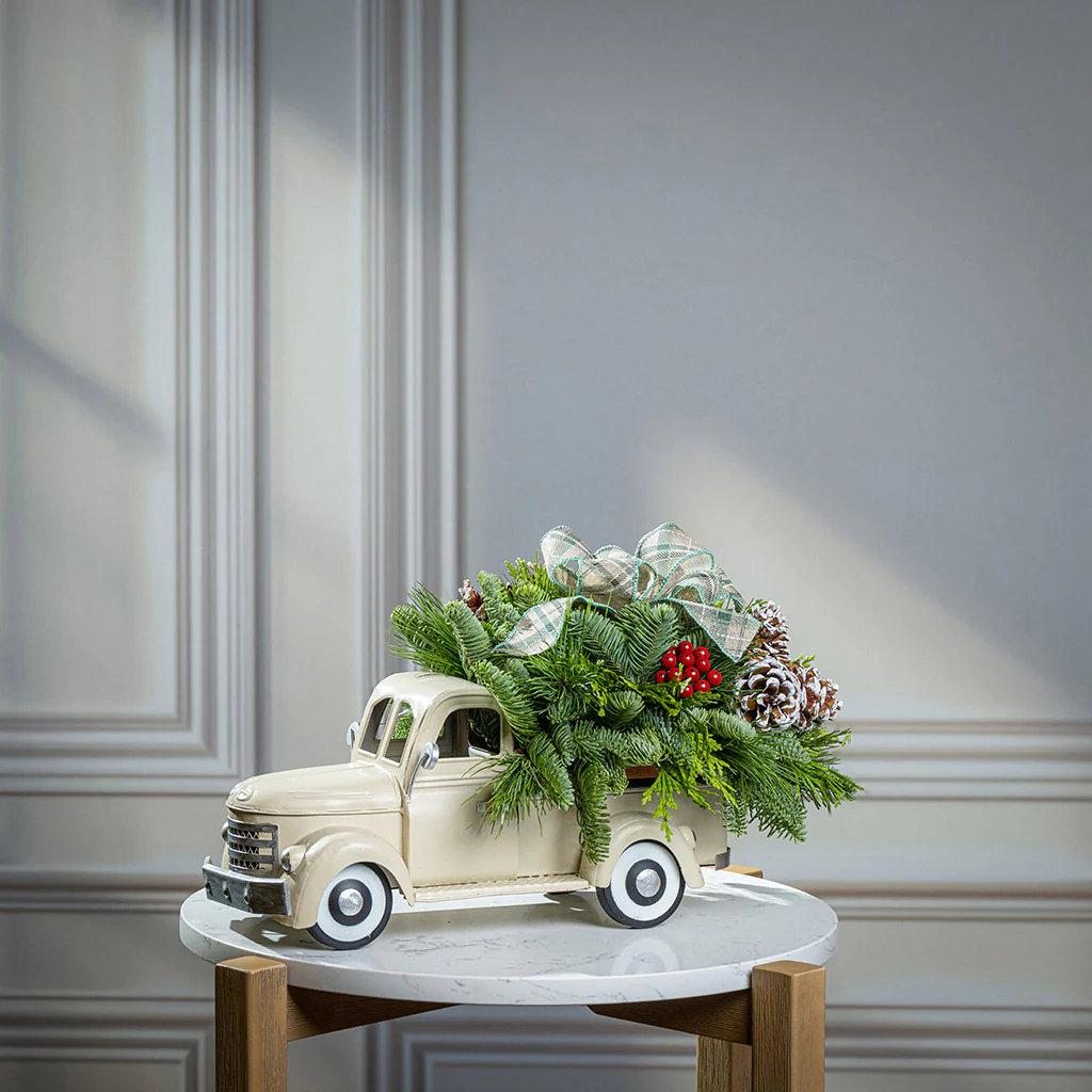 Beep beep! Deliver the cozy spirit of the season right to your door with our Through the Woods centerpiece! Reminiscent of a nostalgic holiday drive through snow-dusted pines, it features a rustic, metal cream-colored vintage truck as its base, bursting with woodland charm and seasonal cheer. Tucked into the truck’s open bed is a lush mix of noble fir, cedar, and pine, accented with faux red berries and frosted pinecones. A classic sage plaid bow sits atop the greenery, adding a timeless touch. Perfect for gift giving or keeping for yourself, this centerpiece makes a stunning statement for a festive table or to haul in a little extra Christmas magic to someone special. Santa’s sleigh isn’t the only ride delivering joy this year!