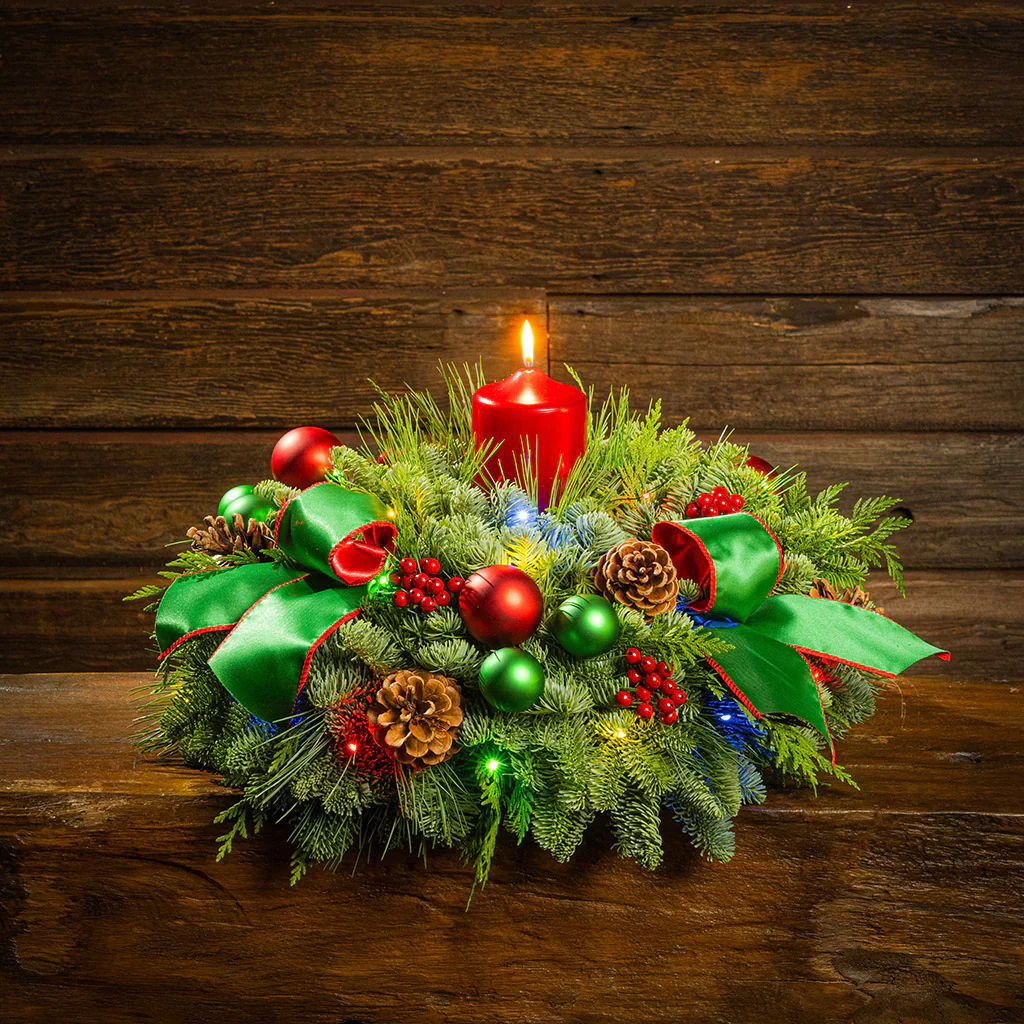 Step back into the joy and sparkle of vintage holidays with Vibrant Celebrations, a centerpiece bursting with nostalgic cheer! It begins with a base of fresh greenery – lush noble fir, cedar, and pine, and is accented with bright red and green ball ornaments for retro flair! Faux red berries and natural pinecones accent the piece, and festive red-and-green satin bow tucks bring a merry pop of color. Nestled in the center is a stunning red metallic pillar candle to deliver radiance to you and your family this holiday season! This centerpiece is extra special for including a set of LED string lights! Our string lights include both warm white and multicolored settings (you choose!) that add extra sparkle and pizzazz to this cheerful creation! This eye-catching arrangement will instantly bring you and your loved ones wonderful memories of past childhood Christmases!