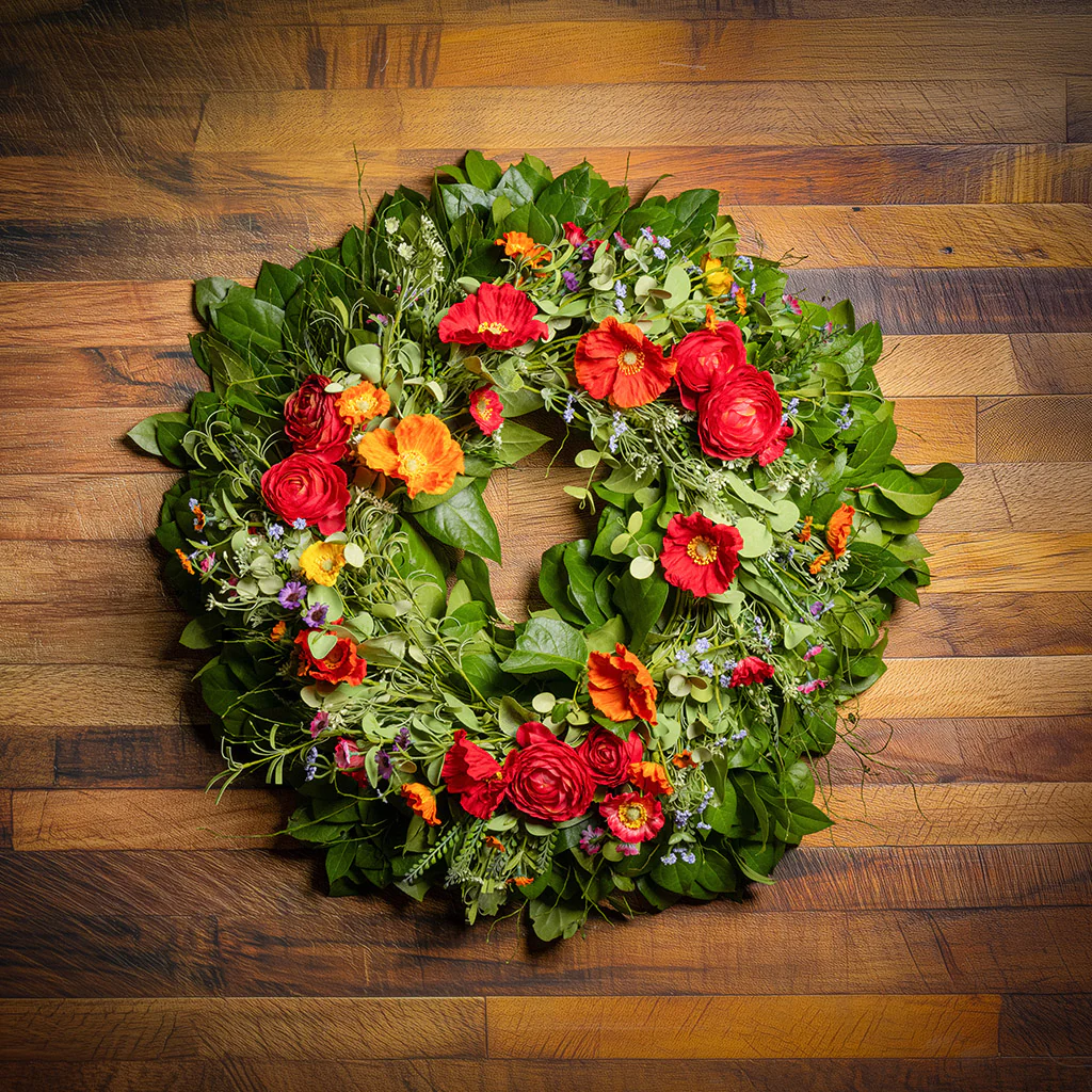 Like a wildflower meadow in full bloom, our vibrant Wild Poppy Garden wreath is a stunning expression of color and beauty! A lush base of fresh salal and sweet huckleberry provides a beautiful foundation for cheerful blooms. The 26” wreath features a delightful mix of faux, artificial poppy flowers in shades of red, orange, and yellow, creating a sense of lively energy. The addition of faux red ranunculus flowers adds a touch of elegance and sophistication. Its cheerful colors and natural textures will create a brush of sunshine in any home. Whether you want to brighten your front door or add a pop of color to your living room, this wreath will impress. This all-natural 26” wreath is handmade with salal and sweet huckleberry branches collected locally from the foothills of the Cascade and Olympic Mountains here in Washington state.
