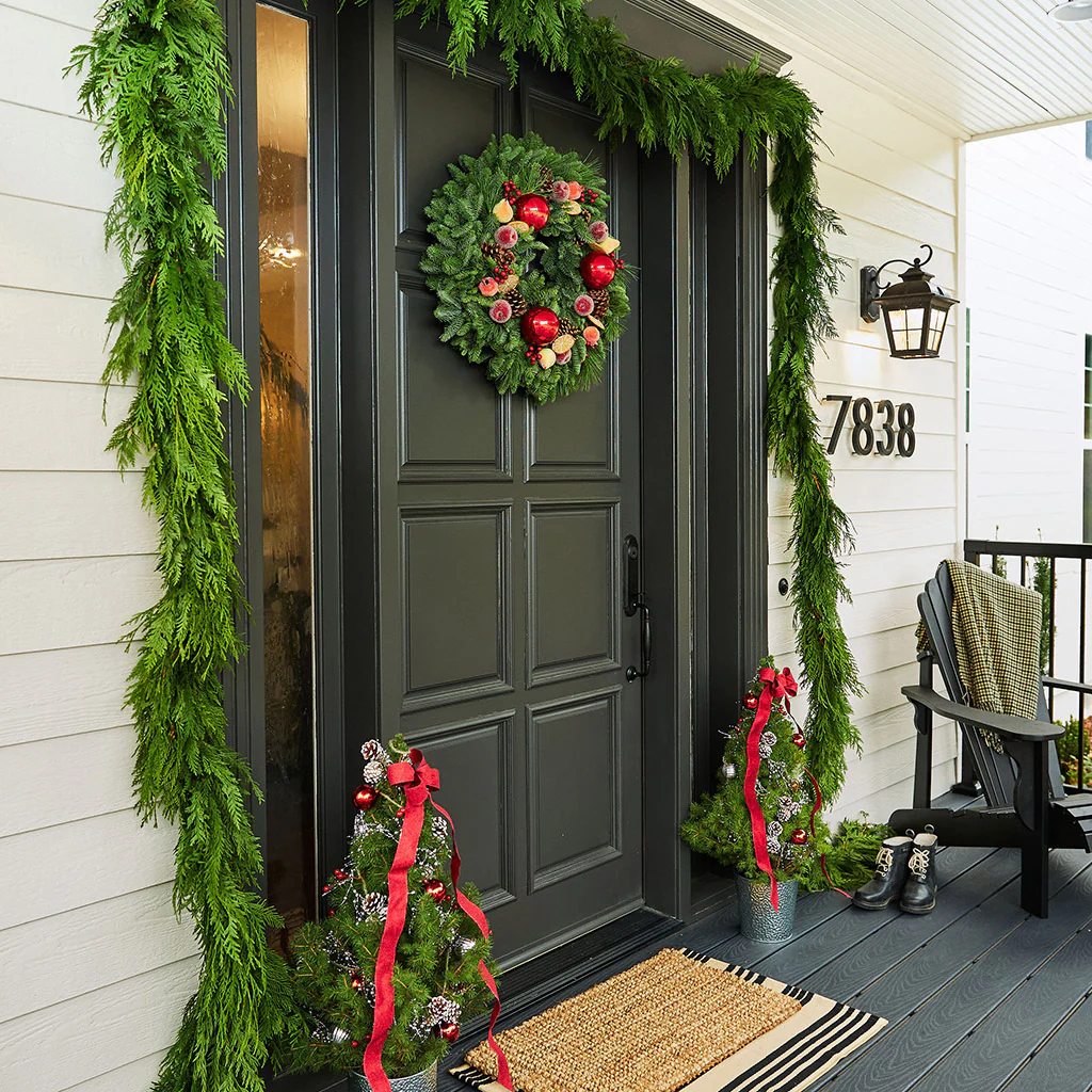 Feel yourself walking through a festive colonial town with our sophisticated yet traditional Winter Orchard wreath. Adorned with gorgeous faux frosted apples, pears, pomegranates, and lemon slices, its lush base of fresh noble fir and pine also includes faux red berries and real pinecones to create a perfect blend of classical artistry and joyful holiday spirit. This exquisite design is reminiscent of the timeless beauty of Della Robbia style, a classic look that marries elegance with natural charm. It’s the perfect way to celebrate the season with a nod to tradition and a splash of modern festivity.